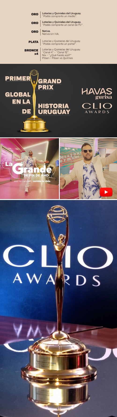 La Dirección Nacional de Loterías y Quinielas felicita a la Agencia de Publicidad HAVAS Gurisa por la obtención de su premio CLIO Awards 2024 a "La mejor campaña de audio y radio del mundo". Este prestigioso premio fue obtenido con nuestras campañas "Podés comprarte una radio", "Podés comprarte un canal de TV" y "Podés comprarte un portal" las cuales promocionaron los sorteos La Grande 2023 y La Revancha 2024. |