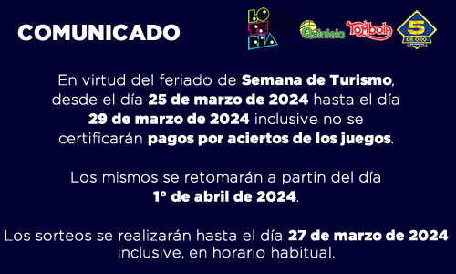 1°) Suspender la realización de los Sorteos de Quiniela y Tómbola Vespertino y Nocturno del día martes 12 de agosto de 2025... [seguir leyendo]